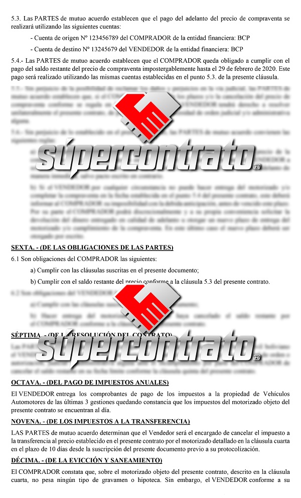 Por lo que a través de un análisis a cabalidad del Contrato de compraventa en Bolivia, nuestros abogados profesionales realizaron la redacción de dos Modelos de contrato de compraventa de vehículo, que son: Compraventa de motorizado al contado y Compraventa de motorizado a crédito. Con la diligencia debida de cumplir la normativa boliviana y resguardar los intereses y derechos de las partes contratantes.